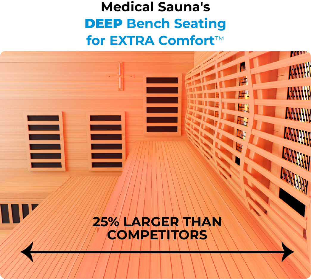 Airplane seats, usually 15 inches wide, are known for being extremely uncomfortable, and believe it or not, many sauna benches are also this size. To enhance comfort in your sauna, we've added seats that are 25% deeper which ensures that even if you have a customer who is big and tall, they can fit and relax comfortably.