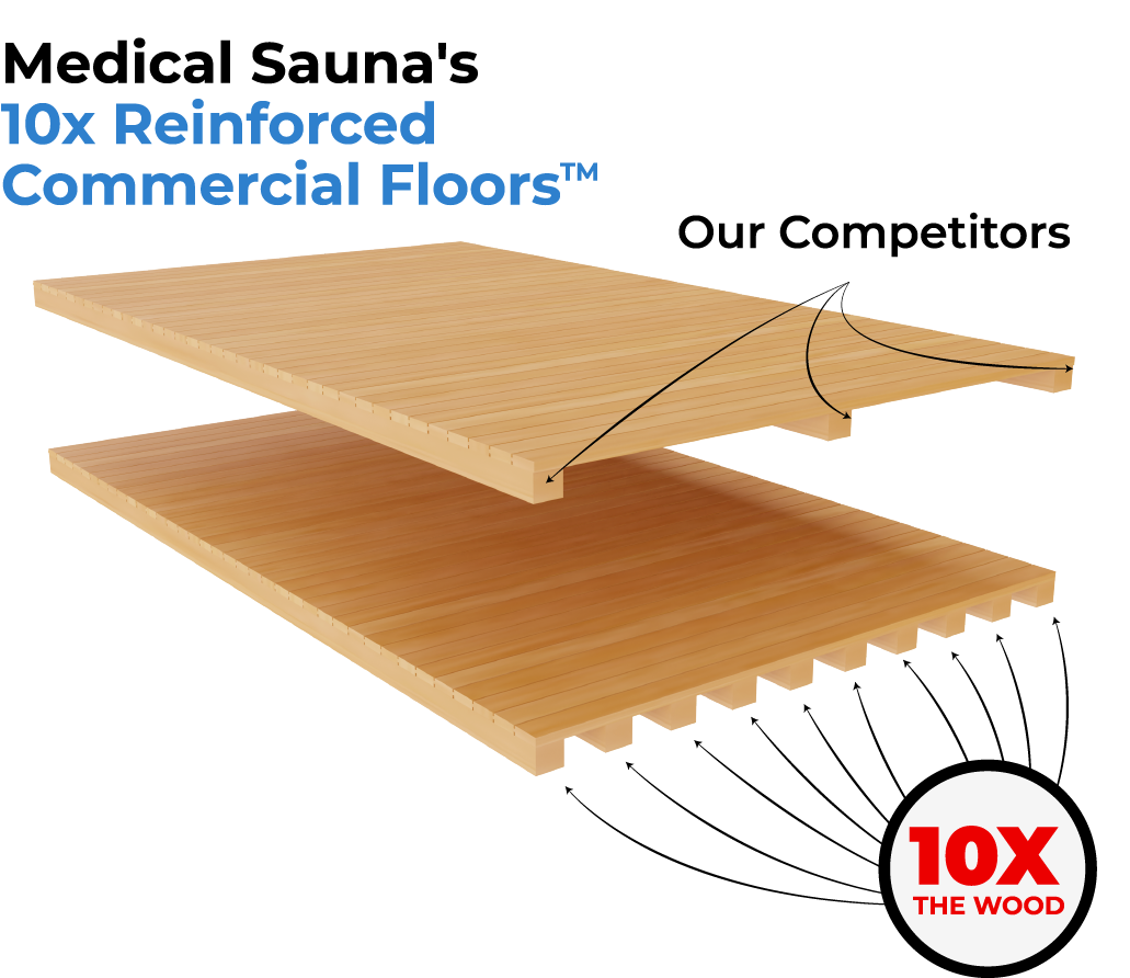 In commercial saunas the floor is the first thing to be damaged.Thats why instead of having wood every 10 inches, we reinforce the floors and have heavy duty wood every 1 inch. This means we use 10 times more wood but it is worth it to avoid any issues.We've included Red Light Therapy in our commercial line, as it's rapidly gaining popularity within the medical community. Ideal for skin health, this cutting-edge therapy helps provide a multitude of benefits, such as reducing wrinkles and acne, enhancing energy and performance, accelerating recovery, boosting mental clarity, and so much more.